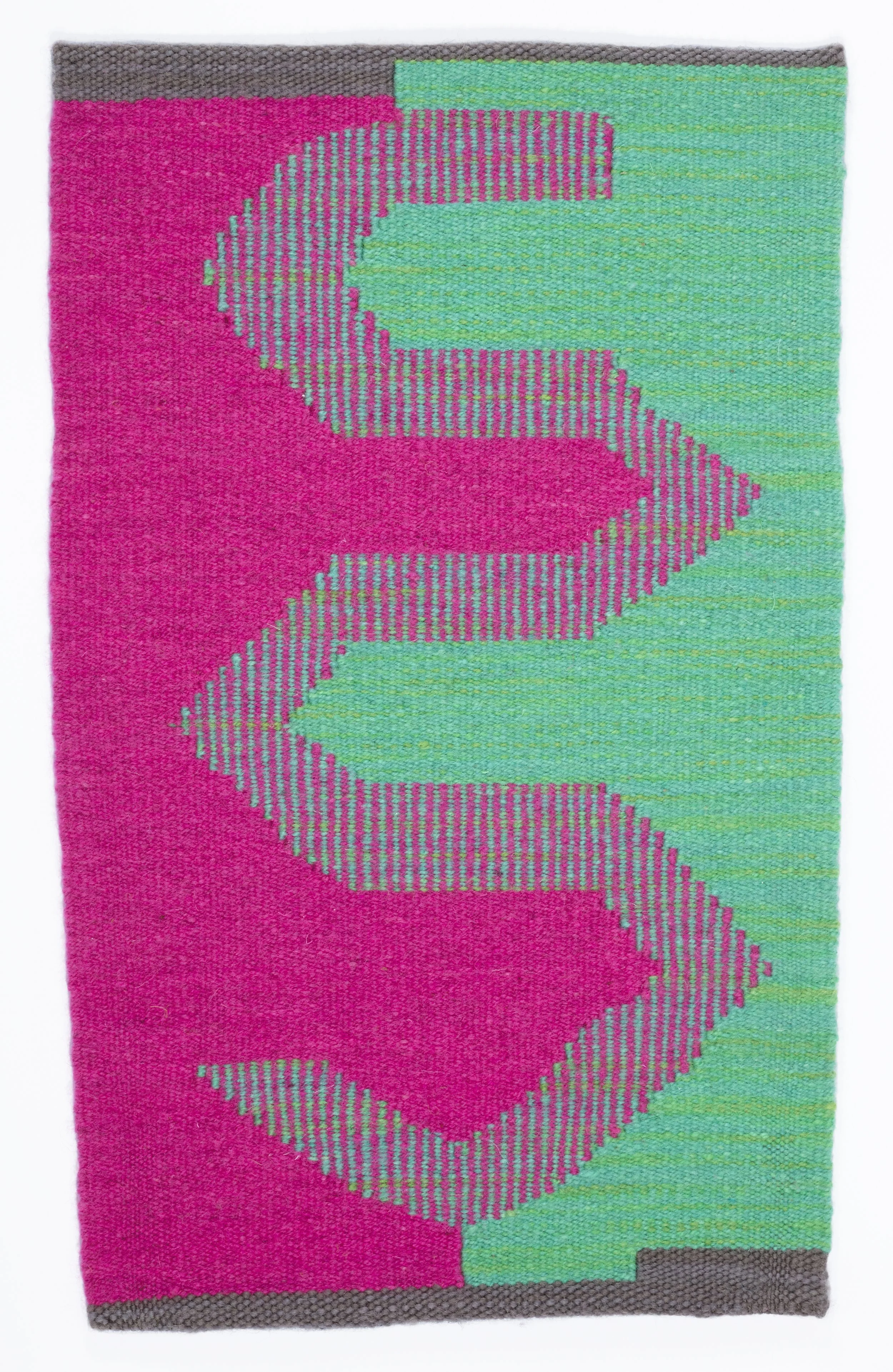 The Neon series of tapestries was inspired by Carmen Herrera’s minimalist abstract paintings, and imbued with an interest in the craft history of neon. Neon is often represented in a commercial context, and the slowness of tapestry weaving felt at odds with the pace of consumerism. These tapestries are woven with wool from sheep raised by my father and stepmother, which is sent to a mill and blended in with wool from sheep all over their region. The compulsion in this series was to muddy a distinction between contemporary and traditional by intermixing medium, colors and symbols from different lived experiences and locations of time, and transposing them into singular compositions.